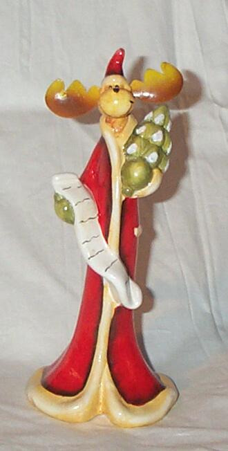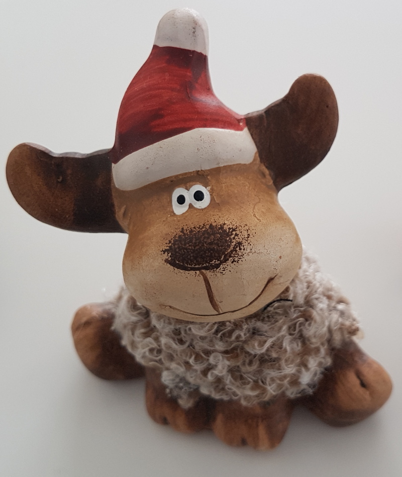 Prozellan-Elch mit Sonnenbrille und rotem Samichlaus-Mantel, der einen Sack mit einer Kerze im Schoss hat. |