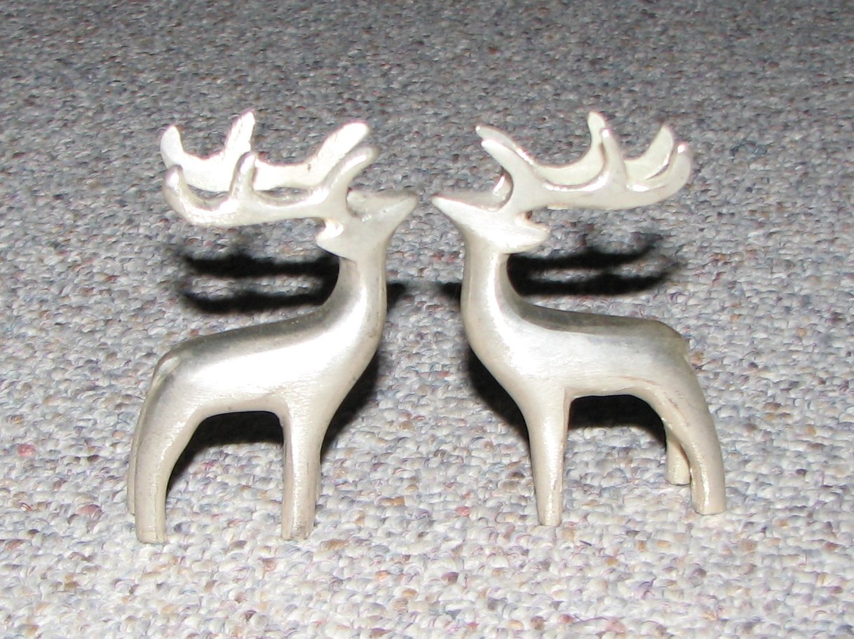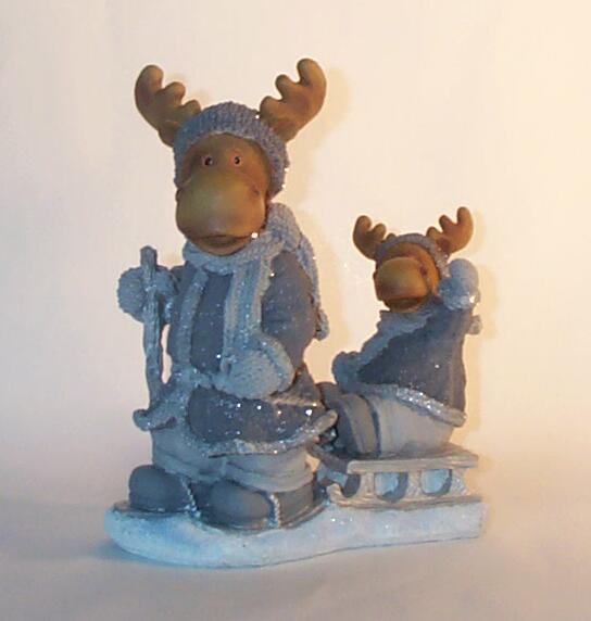 Zwei winterlich angezogene Elche aus Keramik/Gips. |