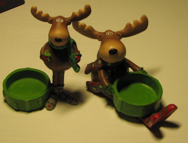 Zwei winterlich gekleidete Elche die Rechaud-Kerzen halten. |