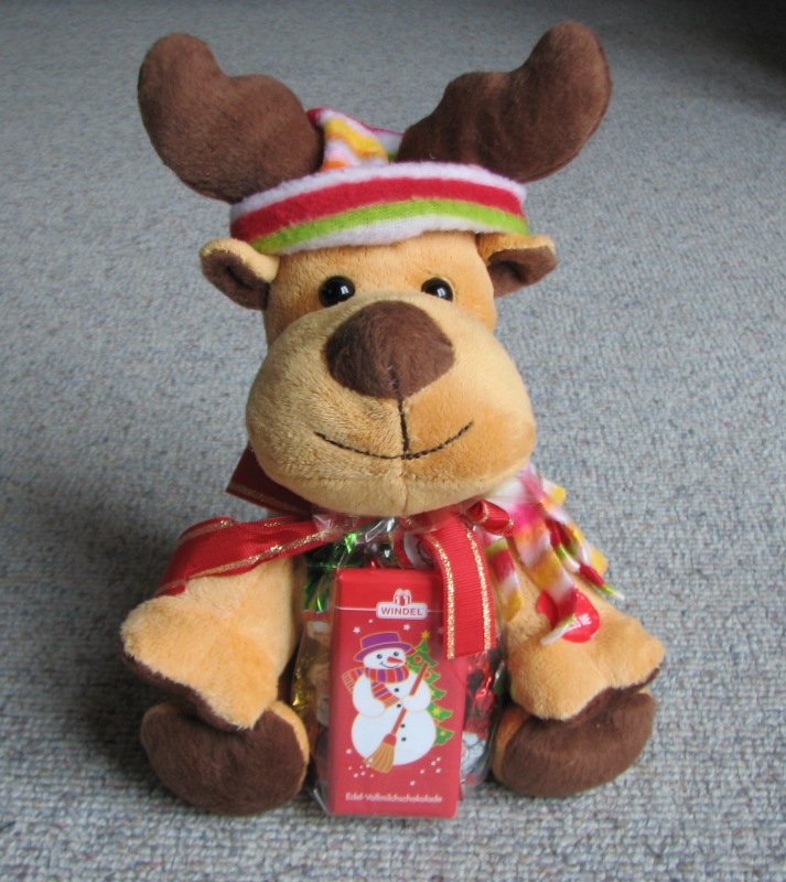 Weihnachtlich gekleideter Plüsch-Elch mit Schoko-Bescherung. Der Elch hat auch einige Weihtnachtslieder im Repertoire.