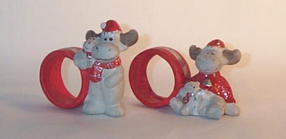 Zwei winterlich gekleidete Elche aus Ton. Sie halten je einen Servietten-Ring. |