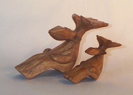 Ein grosser und ein kleiner Elch in sitzender Position aus Holz geschnitzt |