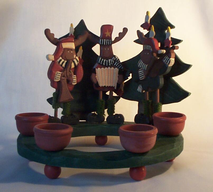 Aus Holz gefertigter Advents-Kranz mit vier Kerzenhaltern und drei weihnachtlich gekleideten und musizierenden Elchen vor Tannenbäumen |