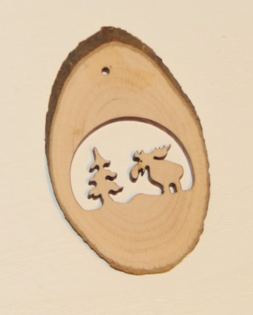 Schlüsselanhänger aus Holz, darin geschnitzt ein Elch im Tannenwald |