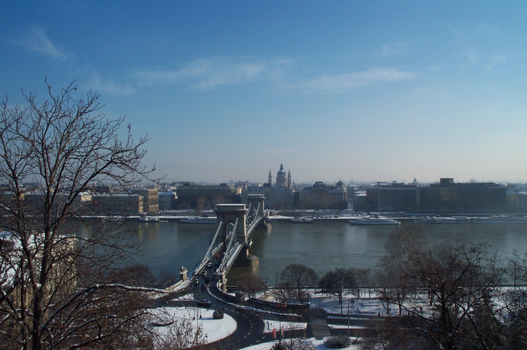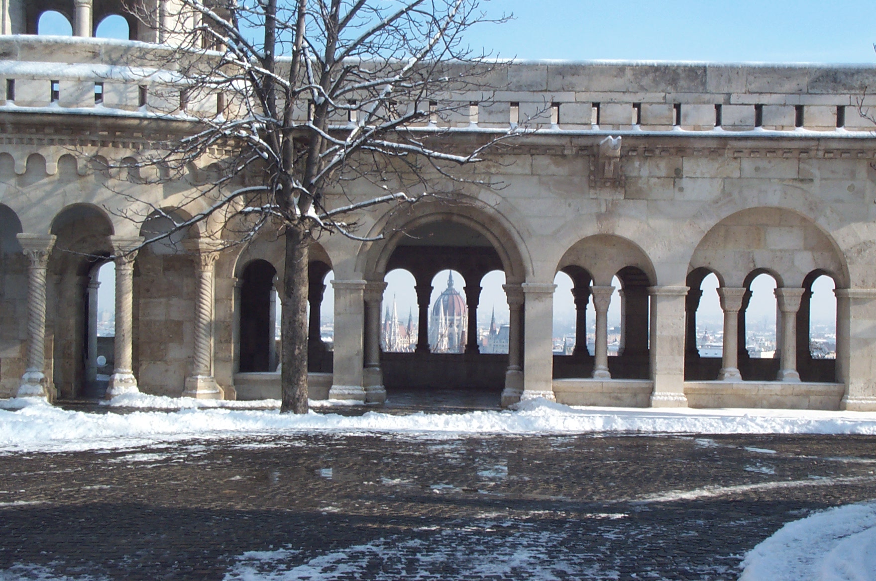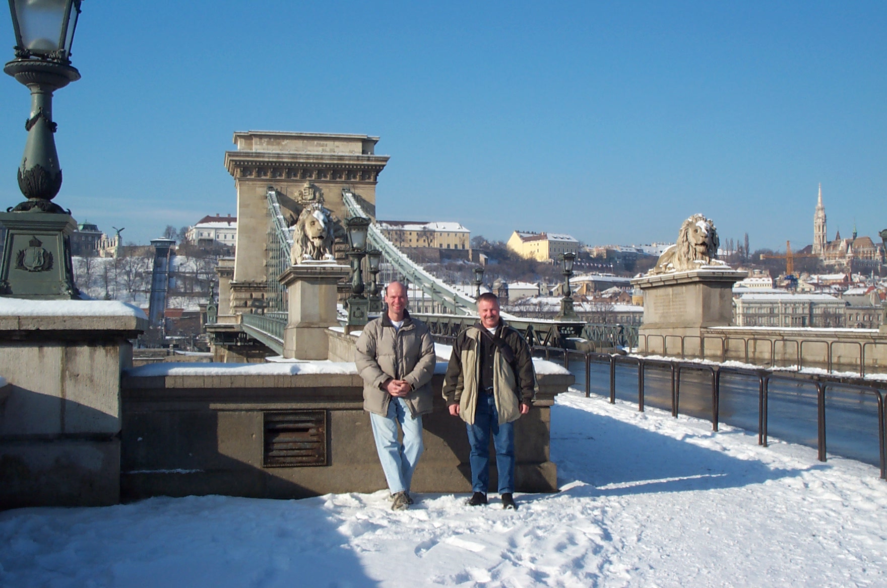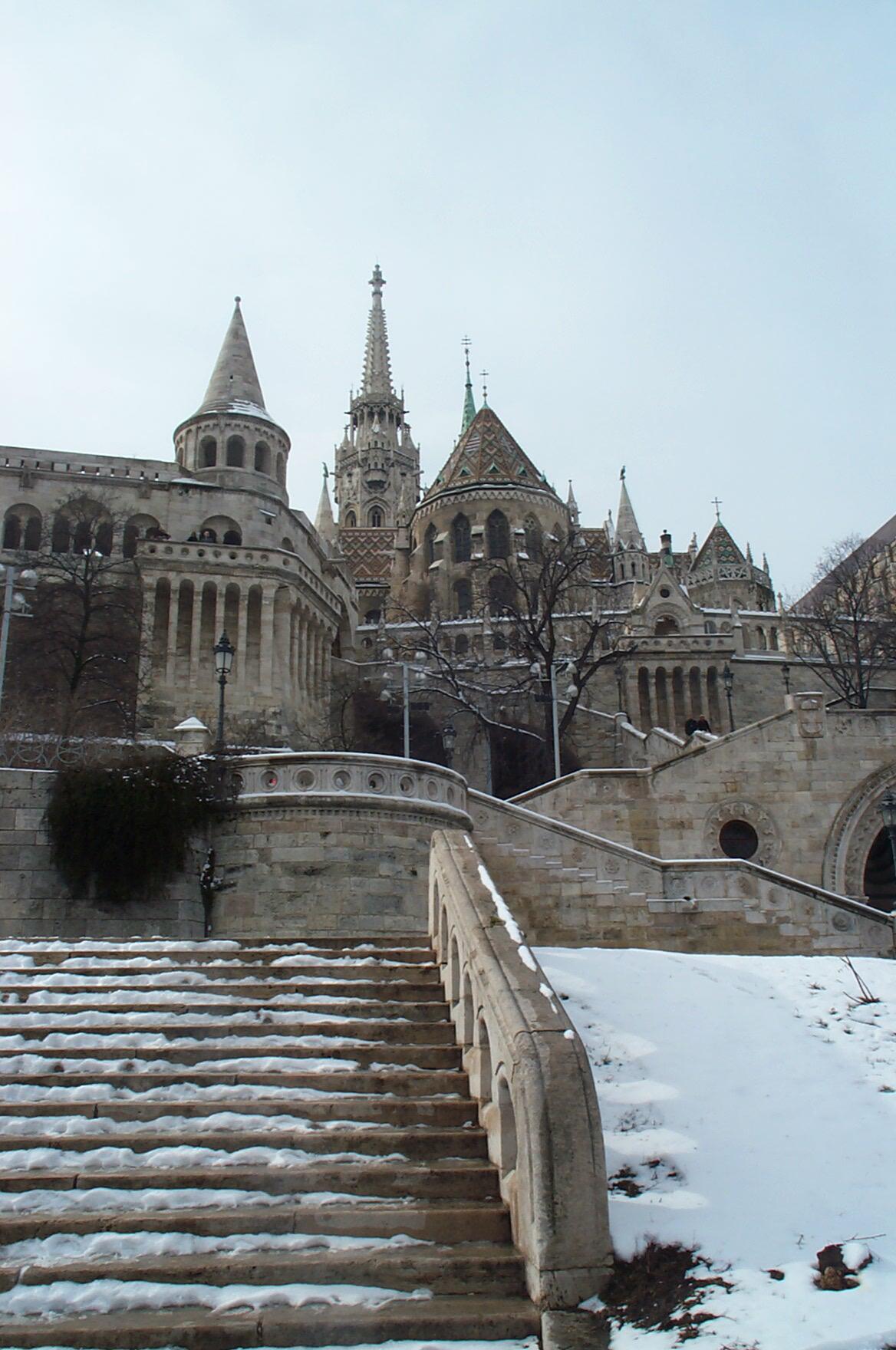 Als wir am 13. Feb. 2004 in Budapest landeten herrschte dichter Schneefall. So hatten wir uns das nicht gerade vorgestellt. Dafür wurden wir am nächsten Morgen mit stahlblauem Himmel und einer malerischen Schicht Puderzucker auf der ganzen Stadt berrascht. |