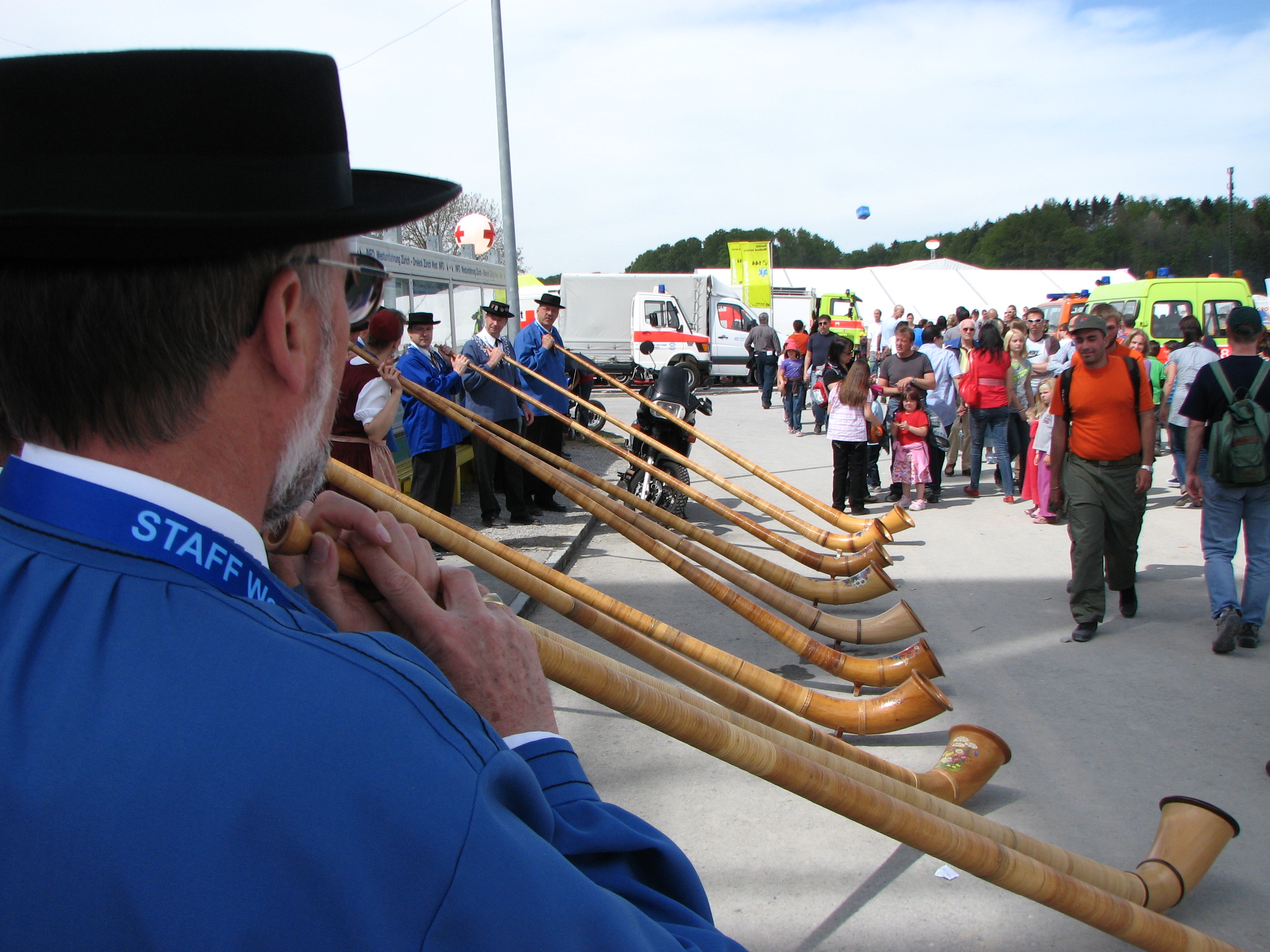 Modern (roboter-gefertigtes Haus) und alt (Alphornbläser) gehören auch zu so einem Fest.