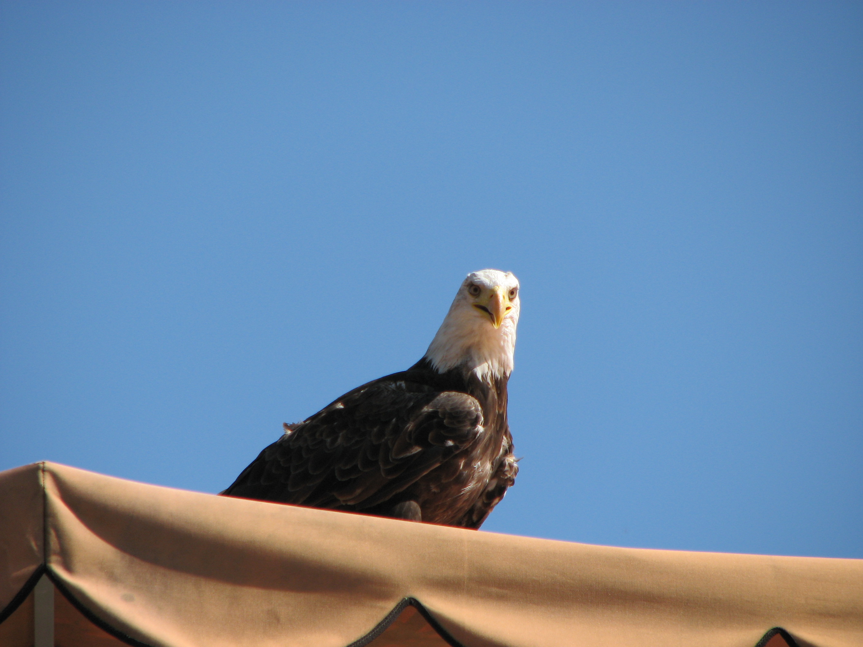Das Steinadler-Männchen (unten links) hat Angst vor Hunden und hat sich auf dem grossen Sonnenschirm in Sicherheit gebracht.