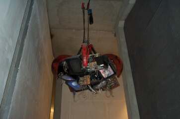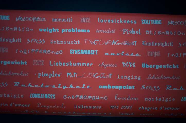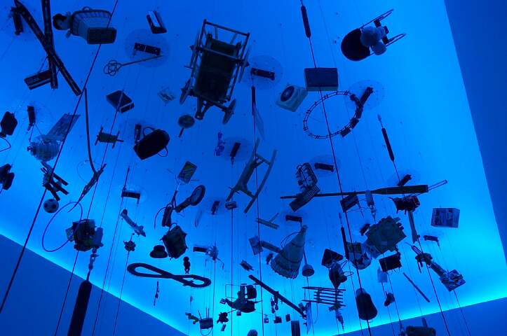 Ohne langes Anstehen - aber schon bös eingeschüchtert von der Mega-Schlange vor dem ollen Migros-Wägeli-Dings - konnten wir rein. Das Bild oben zeigt einen Raum, in dem Erinnerungen an langen Seilen hängen und runtergezogen werden können. Alles in Blau getaucht, eine amüsante Sache.